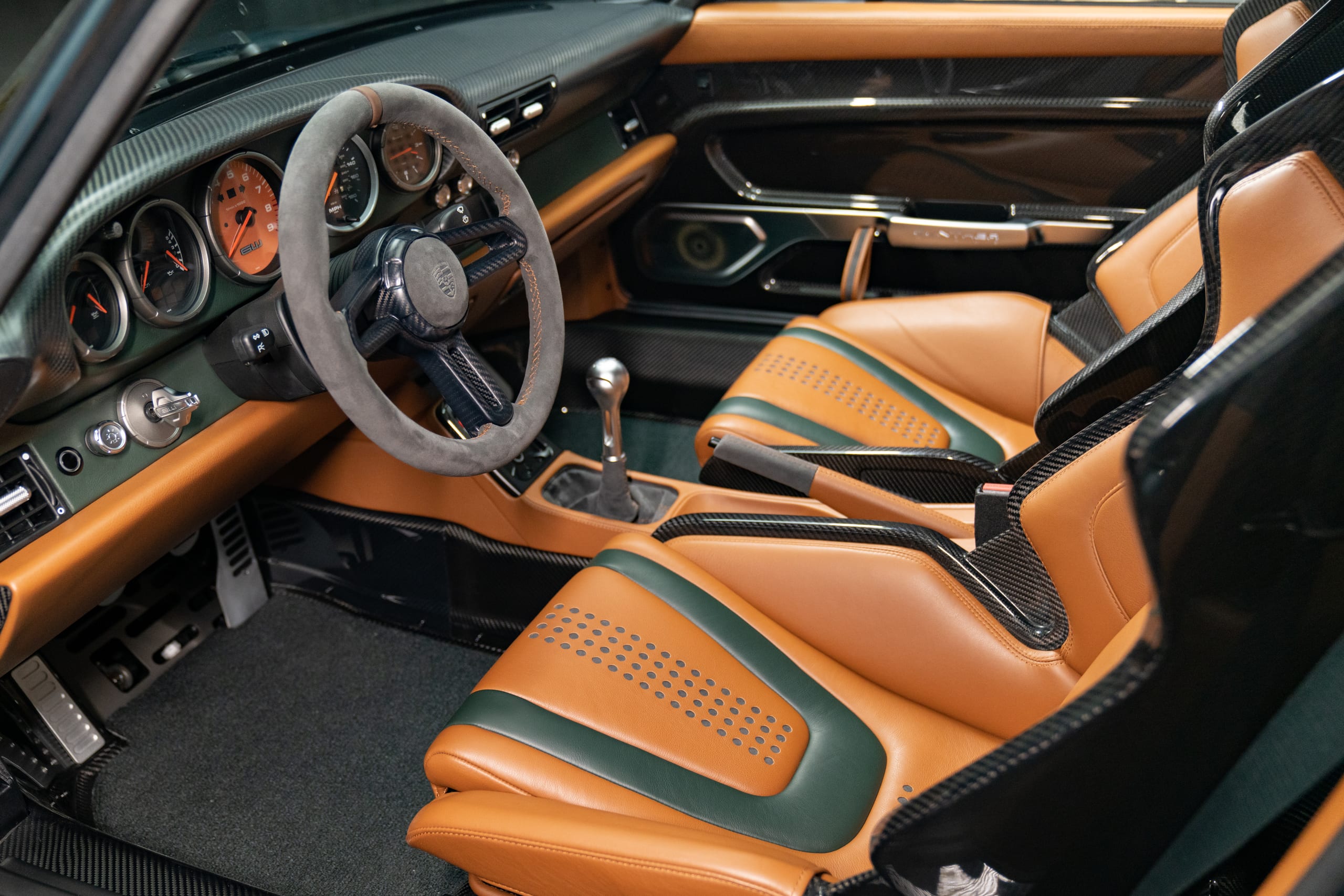 - Alcantara and leather trimmed carbon fiber–backed bucket seats