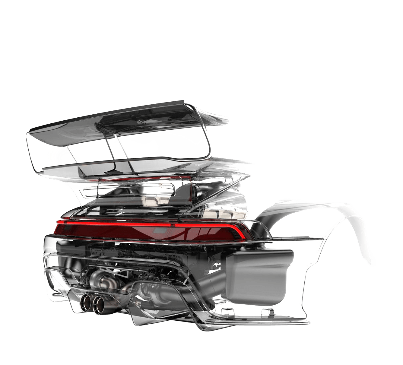 The F-26 Program is sculpted entirely from carbon fiber, with its dramatic front end paying tribute to the iconic Porsche® 930 Flachbau and 935 racers. Beyond its striking presence, every element is engineered for performance - fixed headlights improve aerodynamics, reshaped ducts and cooling channels enhance airflow and thermal management, and integrated aero components deliver greater downforce and stability at speed. The result is a body that fuses heritage-inspired design with cutting-edge function, embodying both style and purpose.